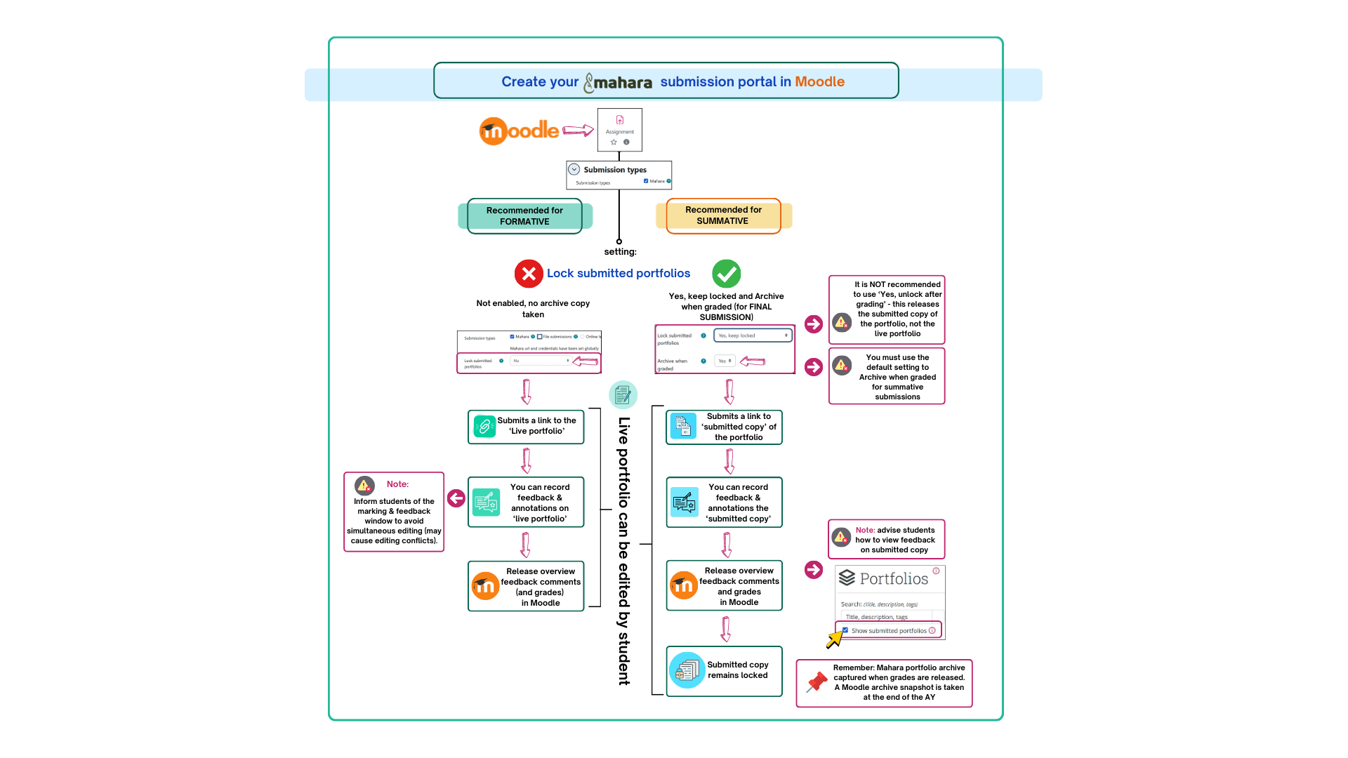 The TEL recommended workflows are below, for three formative e-portfolio assessment scenarios, using Mahara. If you are setting up a summative e-portfolio assessment visit Mahara – Summative. The guidance provided is for typical use of Mahara.